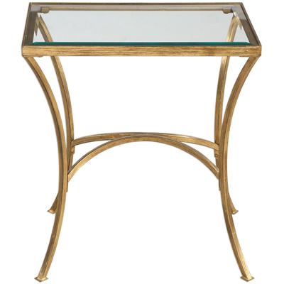 Gracefully arched hand forged iron finished in heavily antiqued gold leaf. Top is clear beveled tempered glass. Packaging
