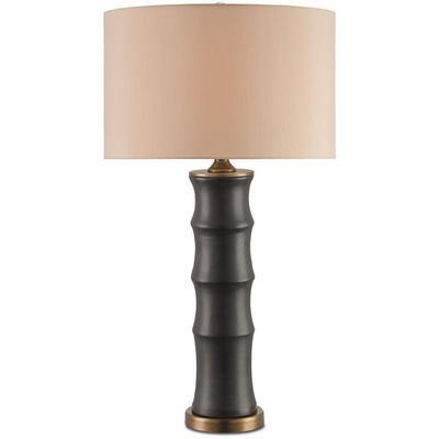 The matte black finish on the column anchors the lamp, which glints when light strikes the antique brass hardware and base.
