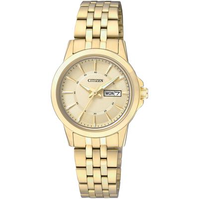 Citizen Ladies' Quartz Watch features gold-tone stainless steel case and bracelet with champagne dial with day and date feature. Case Size: 27.5 mm.