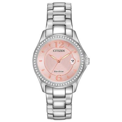 Classic lines and a hint of sophistication allow for this Citizen Silhouette Crystal timepieces to stand out. Shining bright with Swarovski crystals and featured in a stainless steel case and bracelet with blush pink dial. Includes date feature. Case Size: 29 mm.