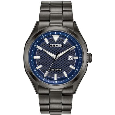 An edgy structure in a classic setting, this Drive from Citizen WDR watch features a deep grey ion-plated stainless steel case and bracelet with a denim blue dial and date. Featuring Citizen's Eco-Drive technology – powered by light, any light. Never needs a battery. Caliber number J810.