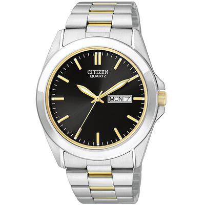 Citizen Men's Quartz Watch featuring a two-tone stainless steel bracelet and black dial. Day/date feature and water resistant. Case Size: 39.5 mm.