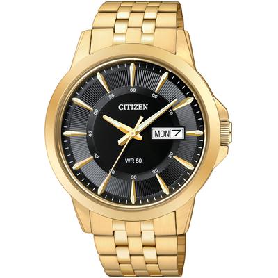 Citizen Men's Quartz Watch with gold-tone stainless steel case and bracelet with black dial with day and date feature. Water resistant to 50 meters. Case Size: 41 mm.