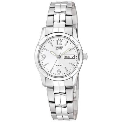 Citizen Ladies' Quartz Stainless Steel Bracelet Watch with White Dial includes day/date feature. Water resistant to 50 meters. Case Size: 25 mm.