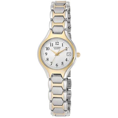 Citizen Ladies' Quartz Watch with two-tone stainless steel and white dial. Date feature and splash resistant. Case Size: 23 mm.