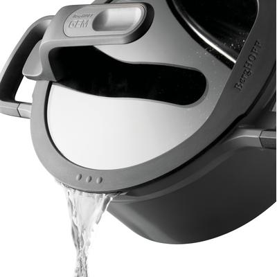- To top this off, there?¥s the clear glass lid that can be placed vertically on the body of the pan to keep your hands free for stirring and serving and has two different sized pouring areas for easy straining of various ingredients.