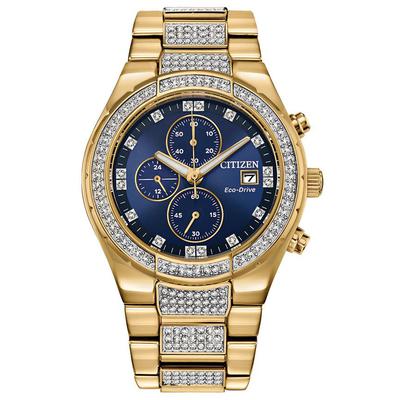 Citizen Men's Crystal Eco-Drive Watch features 180 Swarovski Crystals on the bezel, on the gold-tone stainless steel bracelet, and as markers. The blue dial includes a 1/5-second chronograph measuring up to 60 minutes, 12/24 hour time and date. Bracelet features a fold-over clasp with push buttons. Powered by Eco-Drive so it charges by any light source indoors or outside and never needs a battery. Caliber B612. Case Size: 42 mm. Water resistant to 50 meters. 5-year warranty.