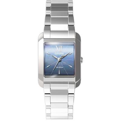 Citizen Ladies' Bianca Eco-Drive Watch in stainless steel features a blue mother-of-pearl dial and a rectangle shape. Bianca is sophisticated yet sporty. And with Eco-Drive technology the watch is always charging by any light source - indoor or out - so you'll never need to change a battery. Covered by Citizen's industry-leading 5-year warranty. Water resistant to 50 meters.