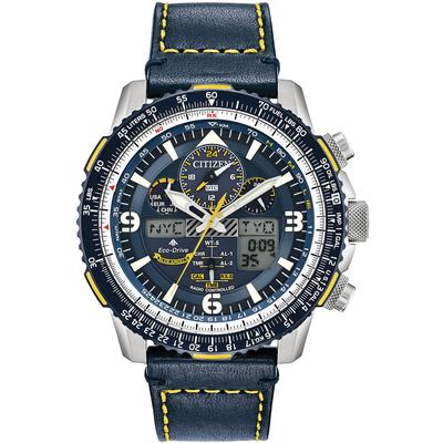 Precision and grace is exhibited in the Citizen Promaster Blue Angels Skyhawk A-T with precise atomic timekeeping in 43 cities. Also features a chrono, perpetual calendar, dual time, alarms, countdown timer, digital backlight and UTC display, power reserve and pilot's rotating slide rule bezel. Model appears in a stainless steel case, indigo blue Italian leather strap with yellow contrast stitching, yellow accented dark blue dial and bezel with the Blue Angel's insignia on the caseback. Featuring Eco-Drive tech–powered any light. Never needs a battery. Caliber number U680.