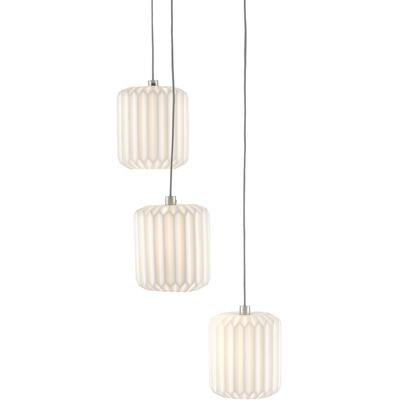 The Dove 3-Light Multi-Drop Pendant has pleated shades made of pale ceramic that diffuse the light wafting through them.