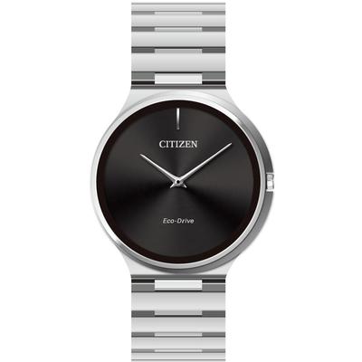 Part of the Stiletto collection, sporting a new asymmetrical design language, this modern unisex watch has a black dial with silver hands and a minimalist look. The silver-tone stainless steel case and bracelet blend seamlessly with a hidden crown to ensure a harmonious experience. And the watch is sustainably powered by light with the Citizen Eco-Drive technology.