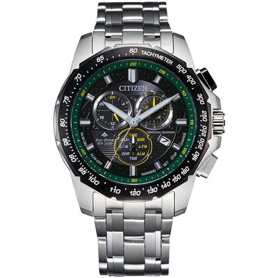 From the stainless steel bracelet design that evokes imagery of tire tracks, to the black dial with bold green and yellow accents, the Promaster MX from Citizen is a racing enthusiast's dream watch. The 43 mm stainless steel case sports advanced features such as a chronograph, dual time zones and a perpetual calendar. The strong design elements and distinctive features are sure to stand out anywhere the road might take you-especially considering this piece powered by light with Eco-Drive technology. Water resistant to 200 meters.