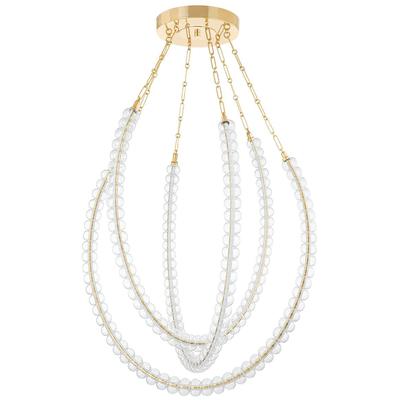 - Clear cast glass beads are strung through swooping LED tubes with a Vintage Brass finish.