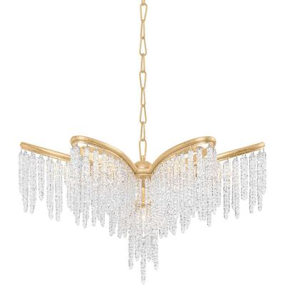 - Glamorous, textured strands of clear crystal hang from a floral framework in Vintage Golf Leaf.