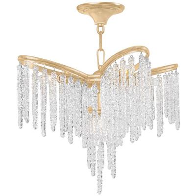 - Glamorous, textured strands of clear crystal hang from a floral framework in Vintage Golf Leaf.