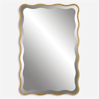 Showcasing a feminine scalloped edge, this shaped wood mirror adds whimsical flair to any design. The mirror is finished in aged gold and has a 1" bevel. Packaging
