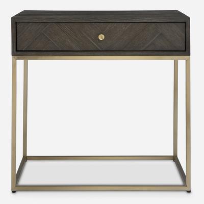Showcasing understated style, the Armistead side table is layered in a dark walnut finished oak veneer accented with a herringbone drawer front. Rests on a steel base in plated brushed brass with a coordinating drawer pull. Packaging